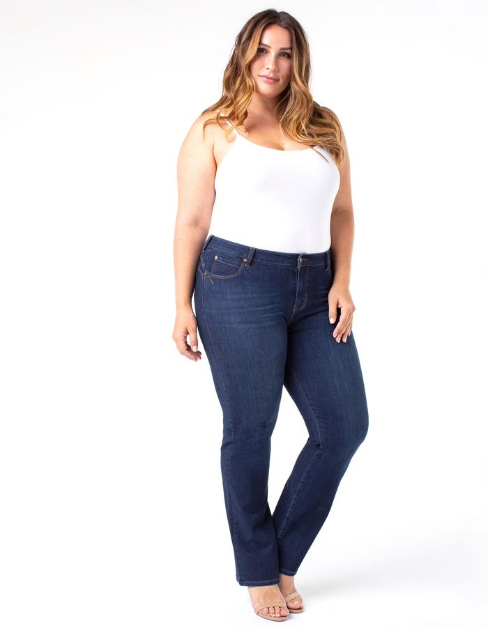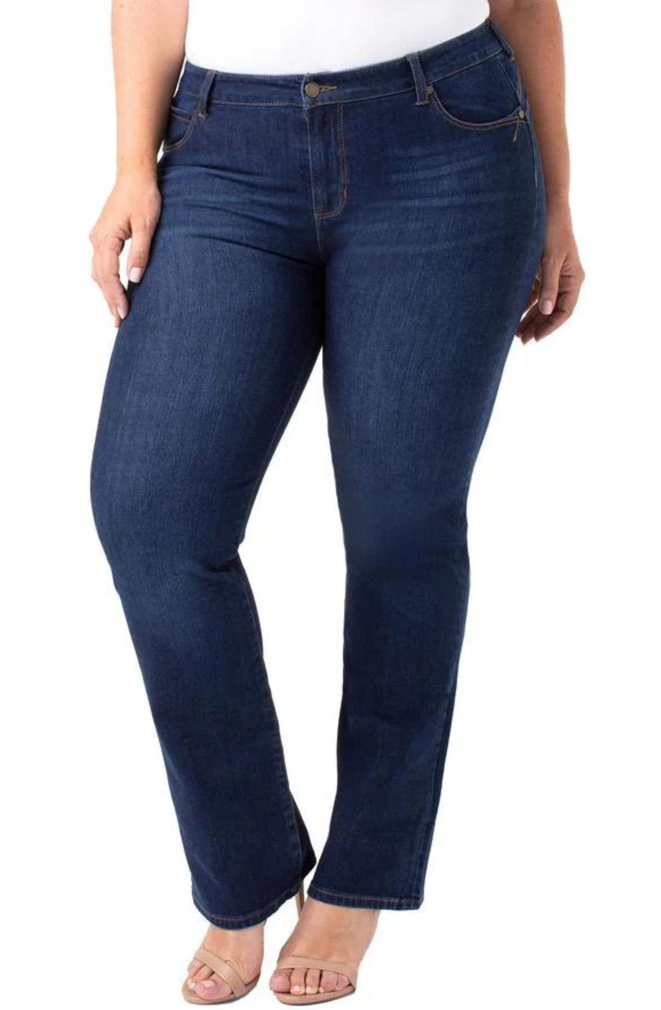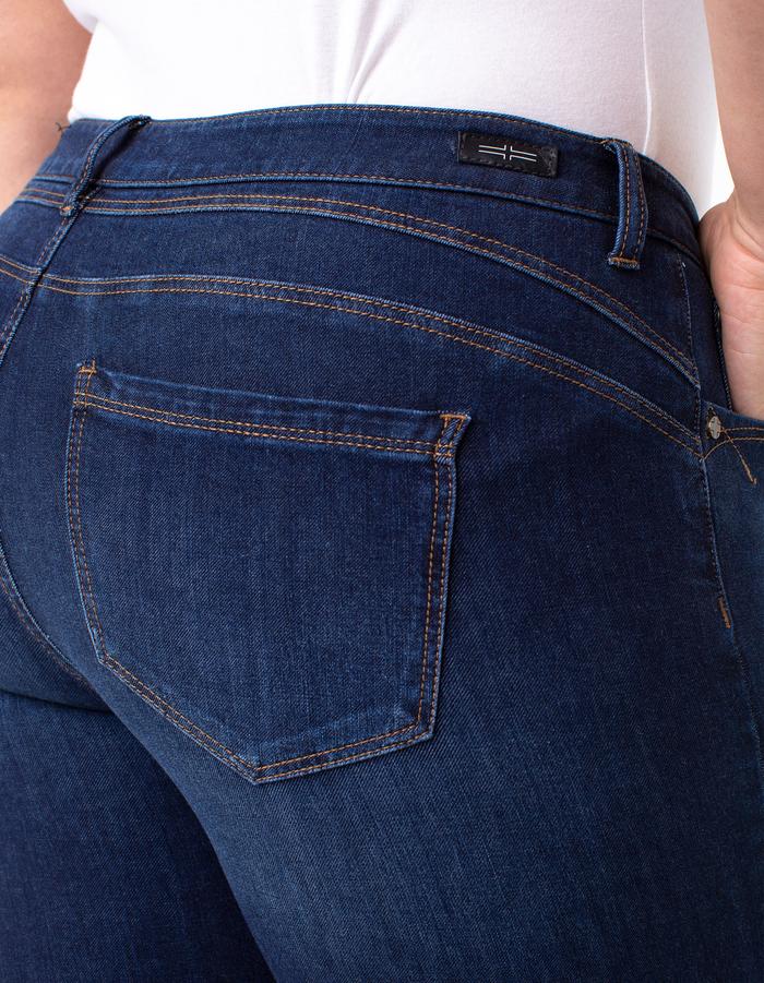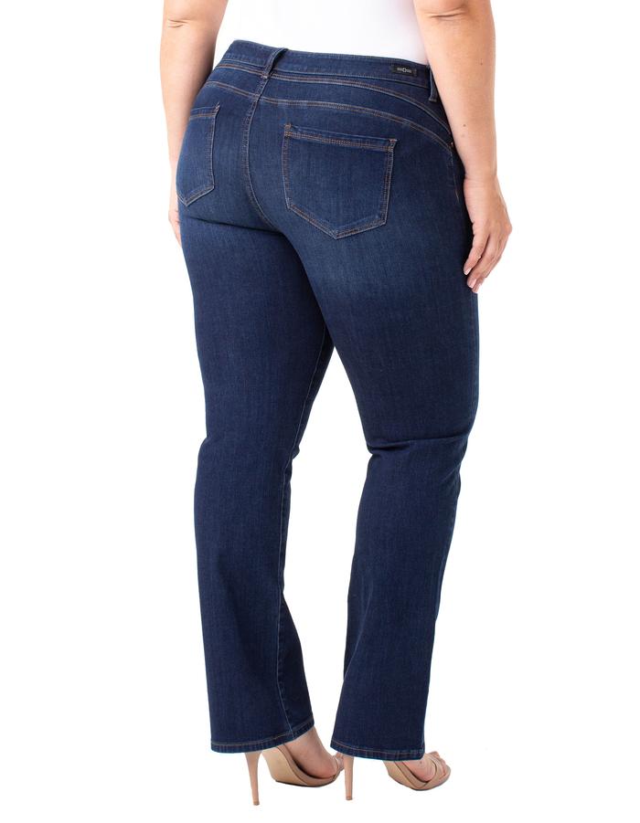 Mid-rise straight denim showcasing Liverpool's signature "Hugger" angled seam detail on the back yoke to create a lifting, shaping and slimming effect.
