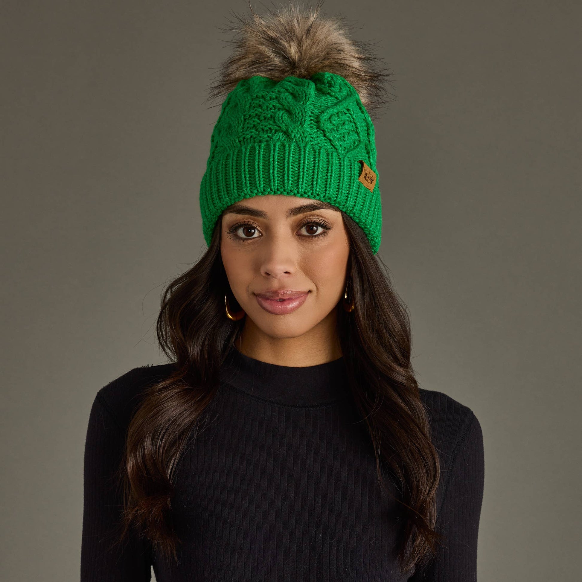 Stay cozy and colorful with this vibrant bright green cable knit pom hat that's impossible to miss. The chunky cable knit texture adds classic charm, while a plush natural faux fur pom-pom on top brings a playful touch to any winter look. Inside, soft fleece lining keeps your head warm and comfortable during chilly days. Whether you're hitting the slopes, running errands, or just embracing the season, this cheerful beanie pairs perfectly with any outfit and guarantees you'll stand out in the best way possible.