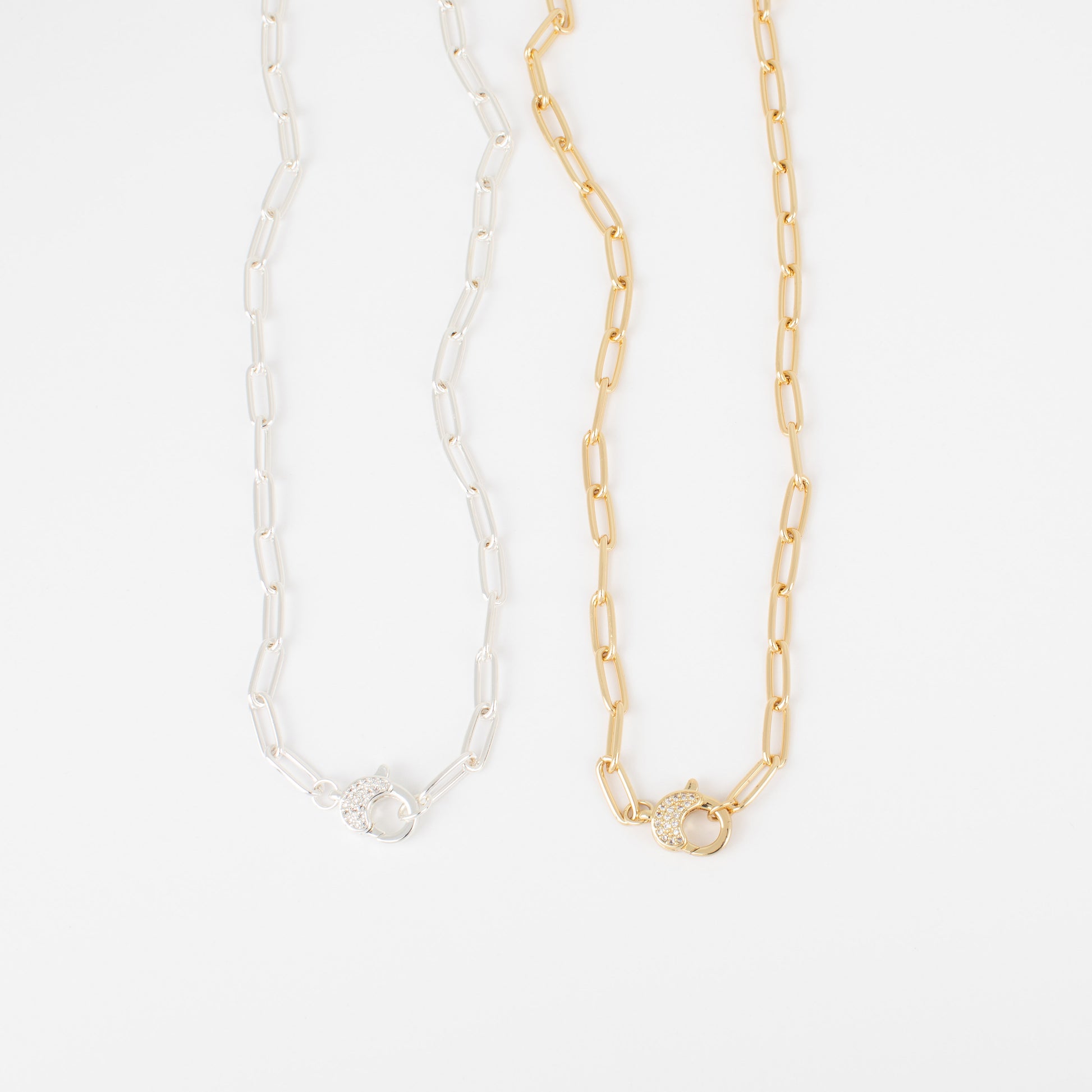 The Lana Necklace is bold, beautiful, and made to shine. Available in silver and gold, this nickel-safe necklace features a striking oval link chain with a statement lobster claw clasp at its center—covered in crystals for an eye-catching sparkle. Adjustable from 17"-20", it’s perfect for layering or wearing solo. With its modern edge and glamorous detail, the Lana Necklace is a stunning standout in any jewelry collection.