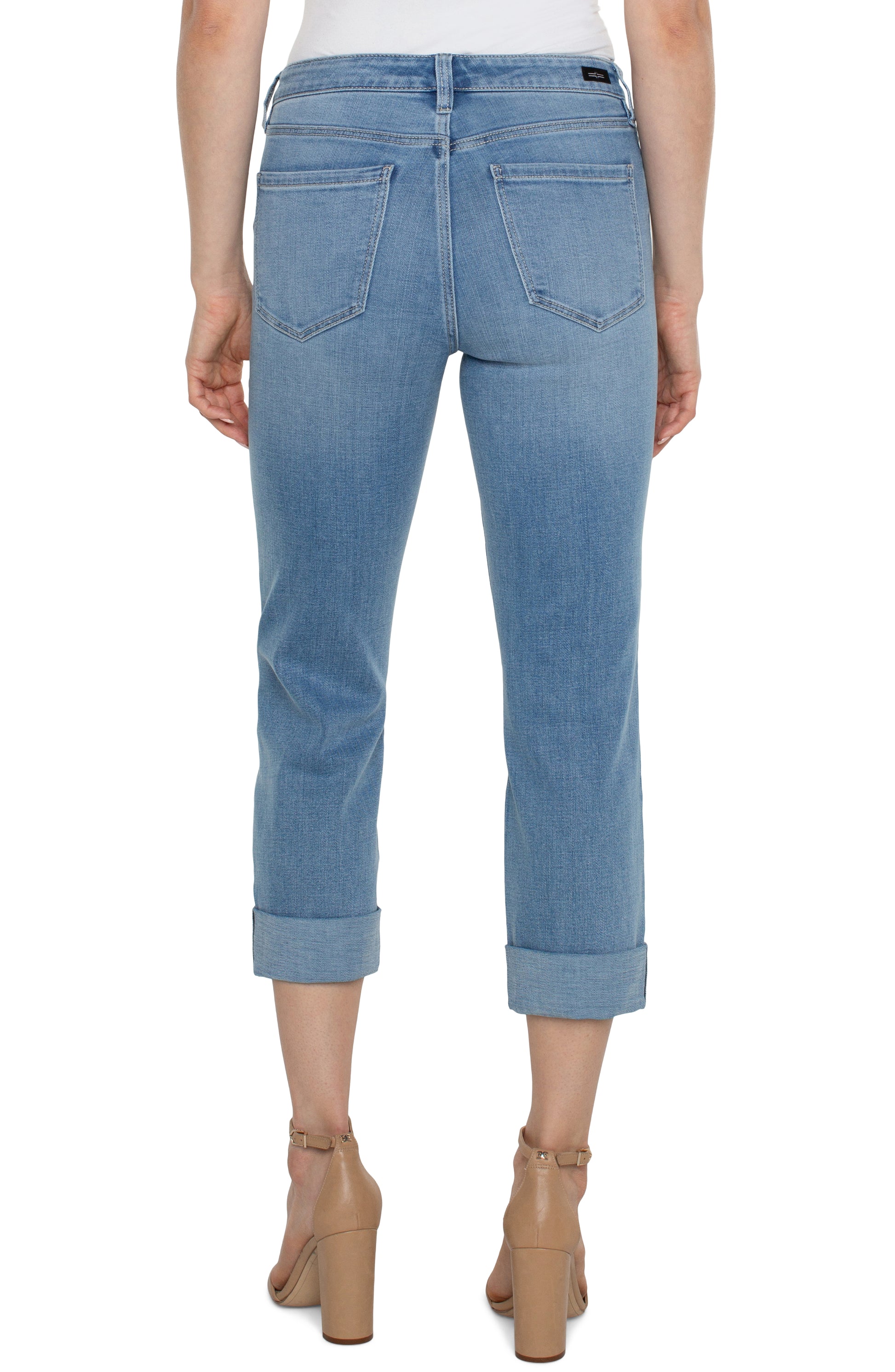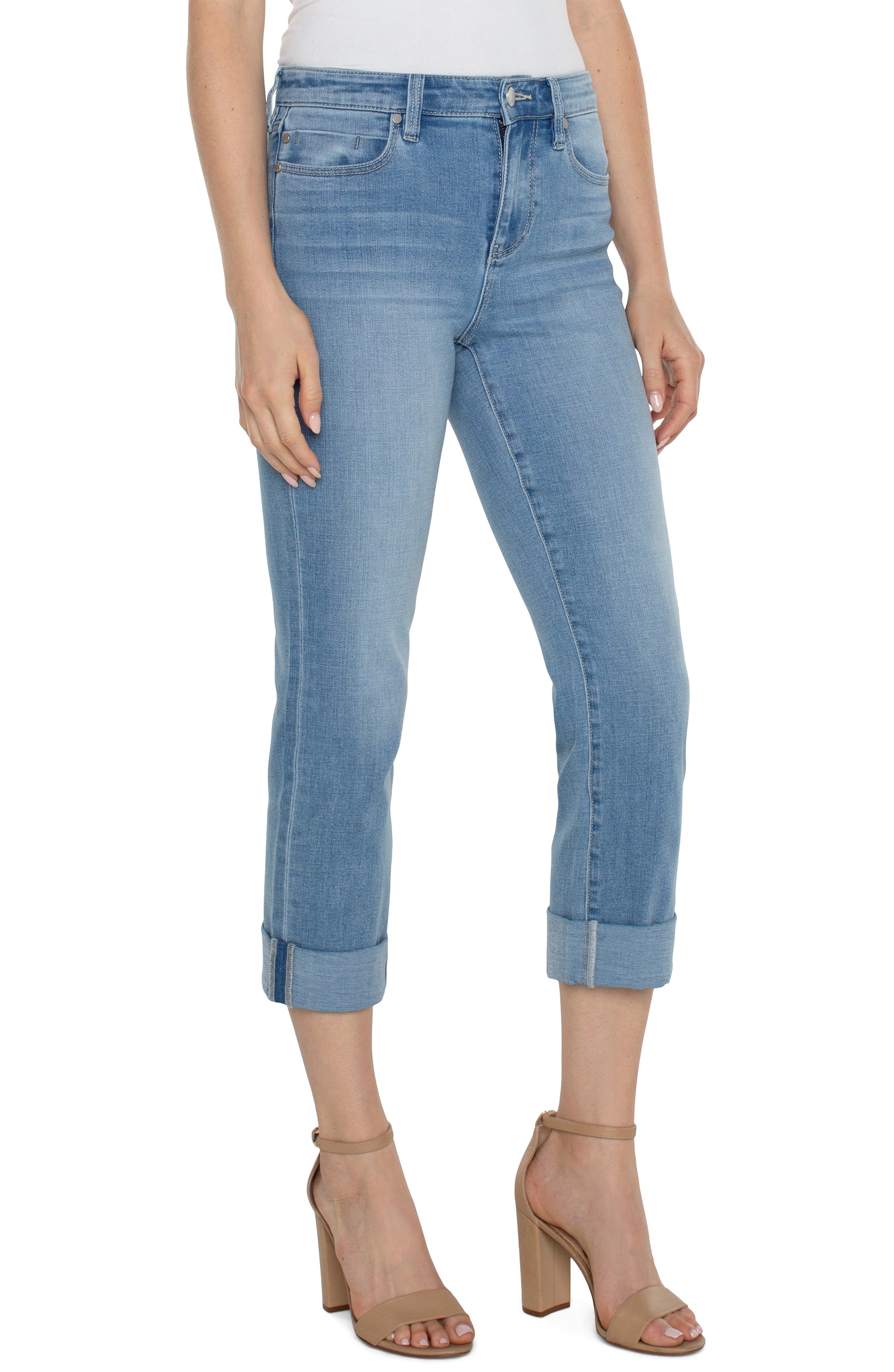 Mid-rise crop showcasing a wide cuff detail from Liverpool's Love by Liverpool Collection. A must have style that pairs perfectly with that shoe you love!