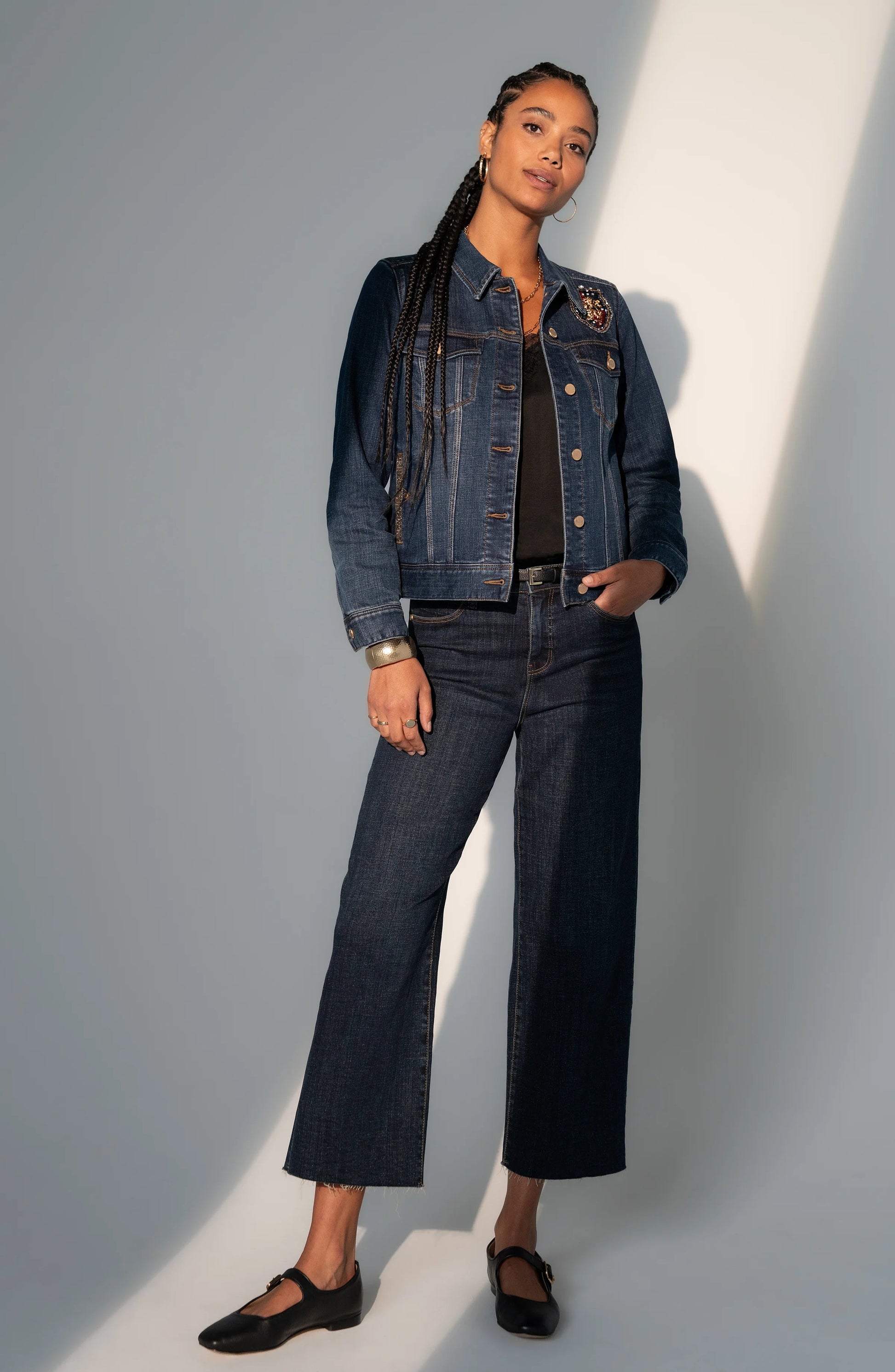 A timeless silhouette with a modern spark. This deep indigo jacket features an intricately beaded crest patch and subtle crystal accents along the pockets, creating a balance of structure and shine. Designed with thoughtful tailoring and soft stretch for all-day ease, it’s an elevated layer that turns classic denim into something extraordinary.