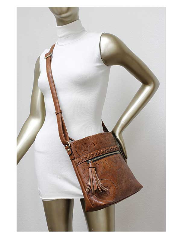 This playful crossbody features tumbled grain vegan leather with a laser-cut top zipper. Inside, you'll find two handy wall-hanging pockets plus a back zipper pocket for easy access. Measuring 11″ wide, 3″ deep, and 10.5″ tall, it's the perfect size to carry your essentials with a pop of fun!