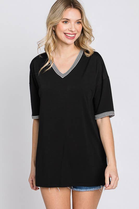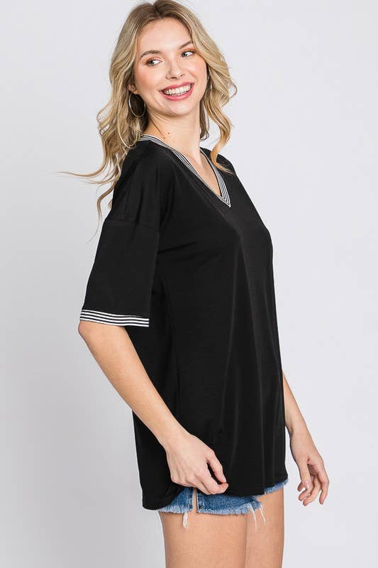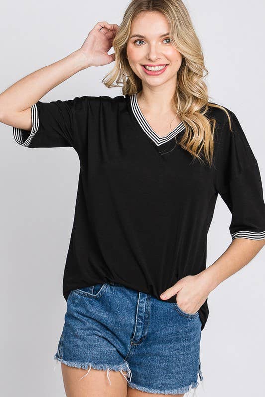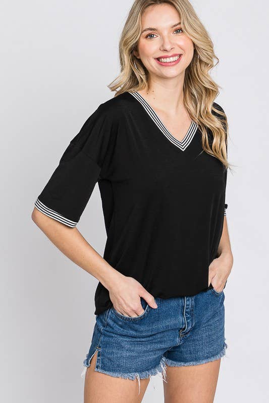 V-neck bulgari top with fun half sleeves, featuring cheeky stripe prints and playful stitching that adds just the right amount of "ooh-la-la" to your everyday style!