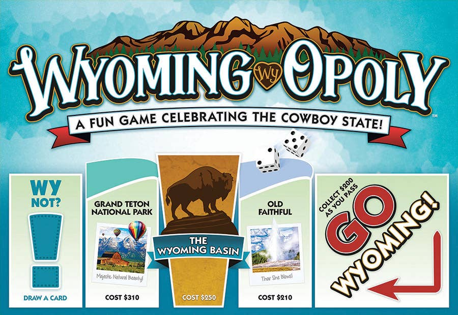 Giddy up and trade your way to success in Wyoming-Opoly! Saddle up and experience all the Wild West adventure the Cowboy State has to offer! From the frontier days to Old Faithful, you never know what kind of exciting surprises are gonna come your way. So, "Wy Not?" Give it a go and do your best to win some free trout - it's a whole lot more fun than getting caught in a drought!